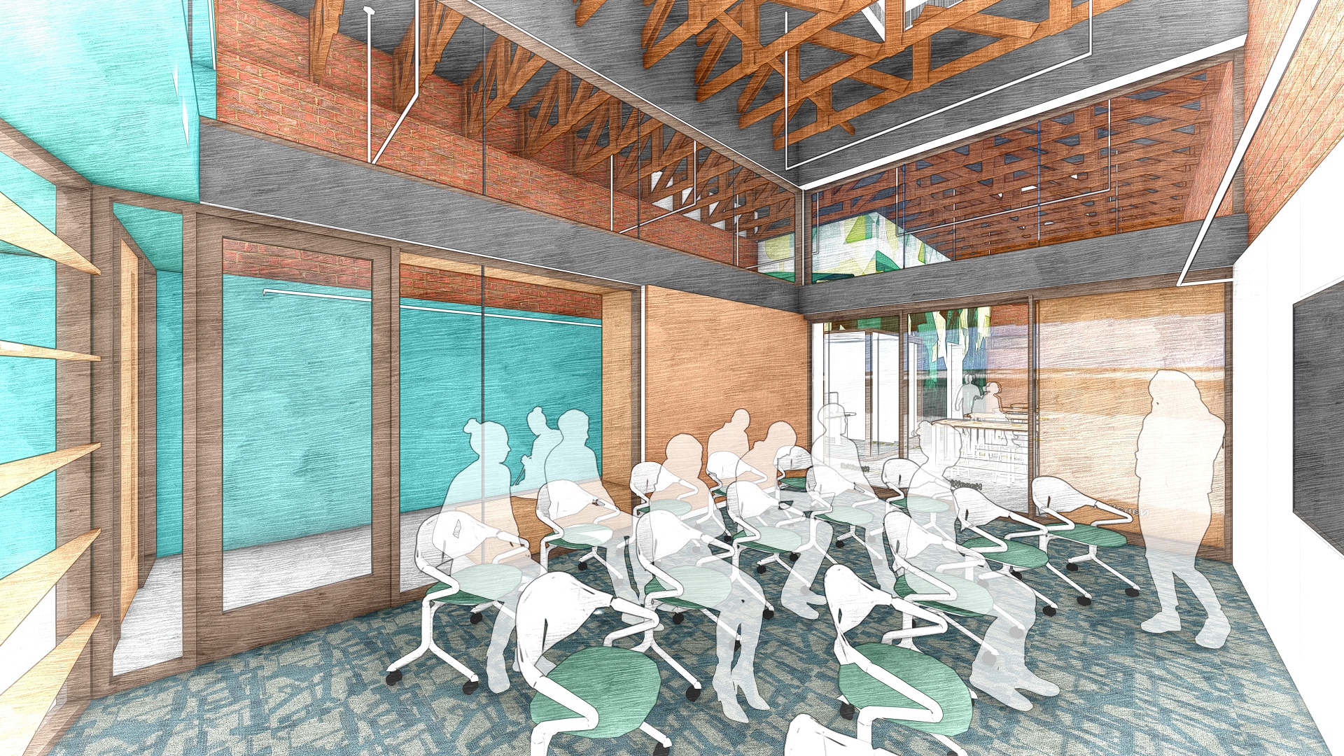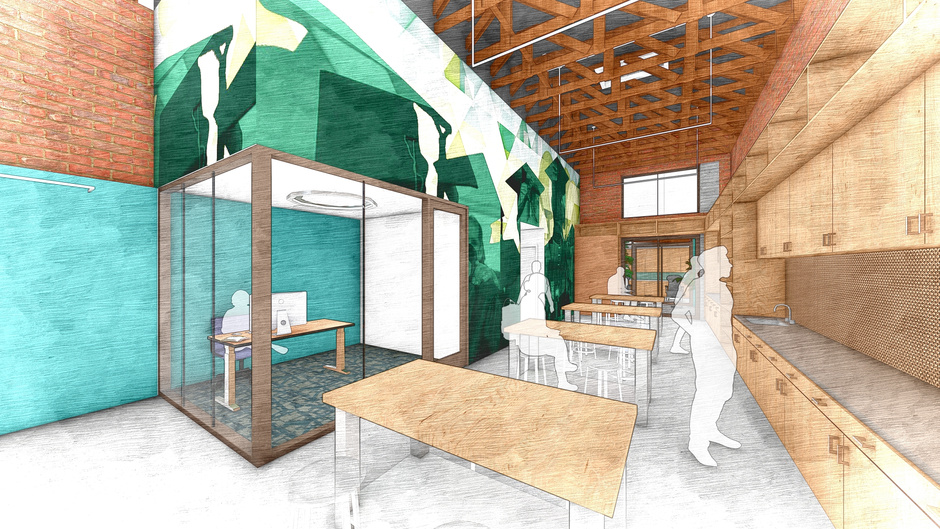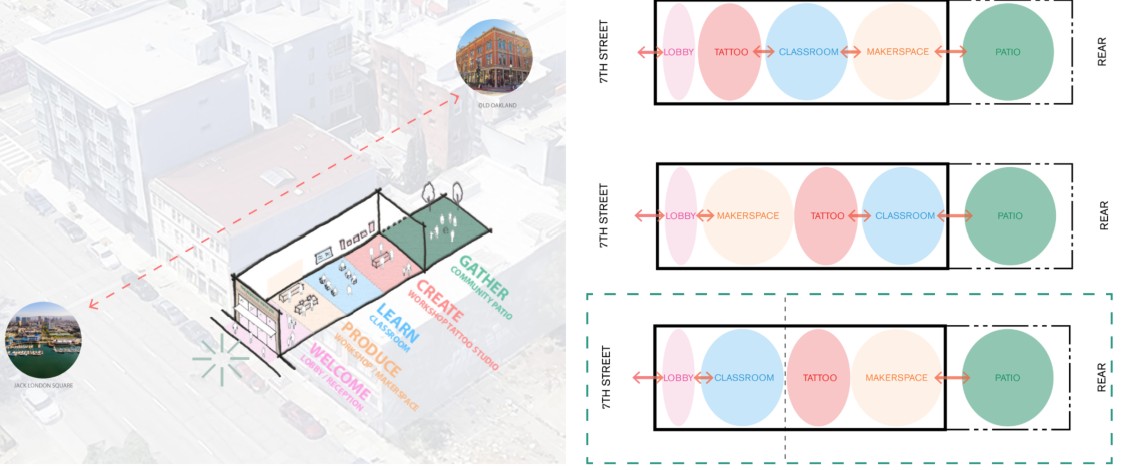LMSA conducted a visioning and engagement process for an adaptive reuse of the existing building at 526/528 7th Street. The building will open onto 7th Street with a glass front, welcoming the community and revealing the creative energy inside. Meeting the vision of a welcoming, light-filled, productive and community-oriented environment, the design of the 25’ x 100’ lot will combine the existing two adjacent storefronts into a high-ceilinged space accommodating a classroom, a fully equipped maker space and workshop, tattoo studio, reception / gallery area, administrative offices, and outdoor patio. The classroom and maker space will provide space for financial literacy coaching, licensing support, and mentorship from established artists and creators. Housed in a new, separate structure connected by a shared courtyard, a tattoo training facility will offer professional mentorship, licensing guidance, and hands-on practice in a safe and structured environment.